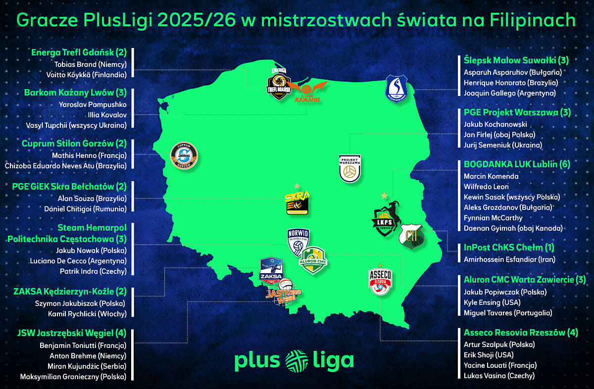 Na Filipinach zagrają w sumie 32 reprezentacje, a w ich składach jest 38 graczy, którzy już w październiku powrócą do Polski i w swoich zespołach rozpoczną sezon 2025/2026 PlusLigi. Minimum jednego mundialowego przedstawiciela mamy niemal w każdym zespole ligowym zespole, bo w trzynastu na czternaście. Rekordową liczbą – bo aż sześcioma reprezentantami na MŚ – może się pochwalić mistrz Polski, BOGDANKA LUK Lublin.