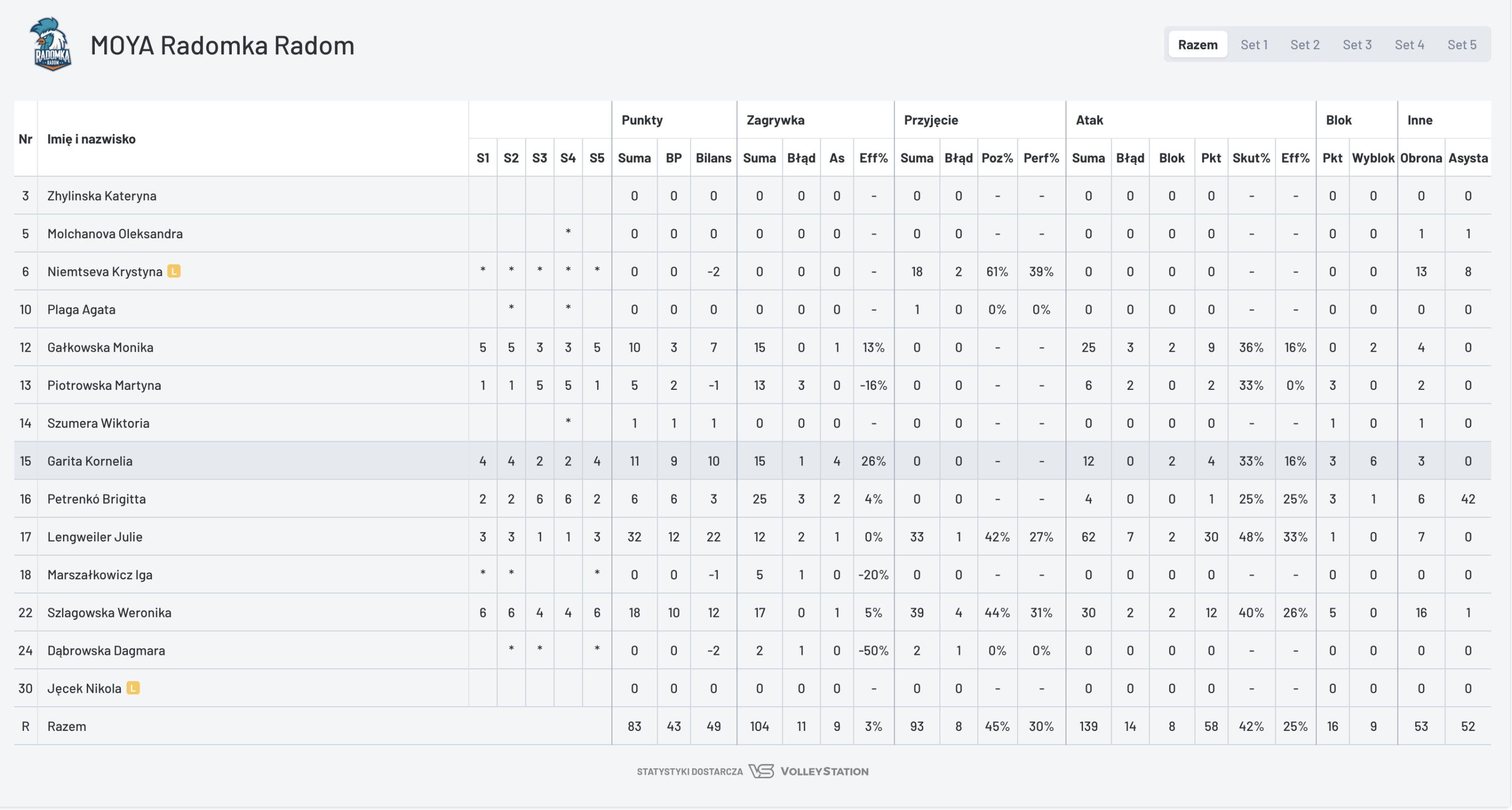 Spotkanie otworzyła mocnym atakiem Mariana Brambilla, ale po uderzeniu Julie Lengweiler mieliśmy remis 2:2. Na 6:3 dla Łódzkich Wiewiór piłkę przechodzącą zgasiła Thana Fayad. Gdy Lengweiler skończyła atak, MOYA Radomka złapała kontakt punktowy (7:8). Łodzianki wróciły na kilkupunktowe prowadzenie, gdy z piłką minęła się Kornelia Garita. Grę postanowił przerwać trener Piotr Filipowicz. Na zagrywce w zespole z Radomia stanęła Brigitta Petrenko i przy jej serwisach gospodynie odrobiły wszystkie straty (12:12). Plas Weroniki Szlagowskiej dał radomiankom prowadzenie 14:13. Regiane Bidias miała problemy z przyjęciem zagrywki Garity, a piłkę przechodzącą skończyła Martyna Piotrowska (17:14). Uderzenie Szlagowskiej dało gospodyniom pięciopunktową przewagę (20:15). Na 23:17 mocno po rękach bloku uderzyła Lengweiler. Ostatni punkt również należał do Szwajcarki, a Radomka wygrała 25:18.